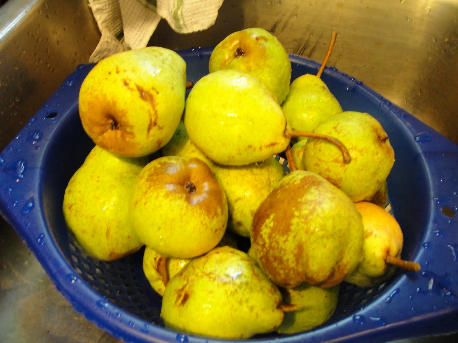 - Peeled, cored, sliced, and pulverized in the food processor 8 pounds of pears.